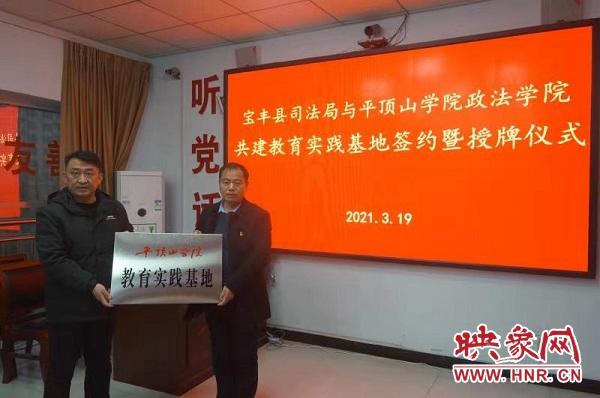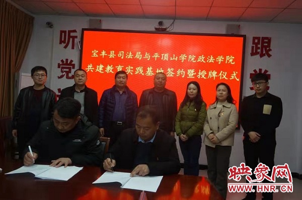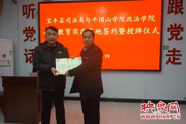 签约仪式上,张晓东代表william威廉与牛志刚局长在共建教育实践基地协议书上签字;为宝丰县司法局授予“教育实践基地”匾牌;为牛志刚、岳朝军两位同志颁发了客座教授聘书。