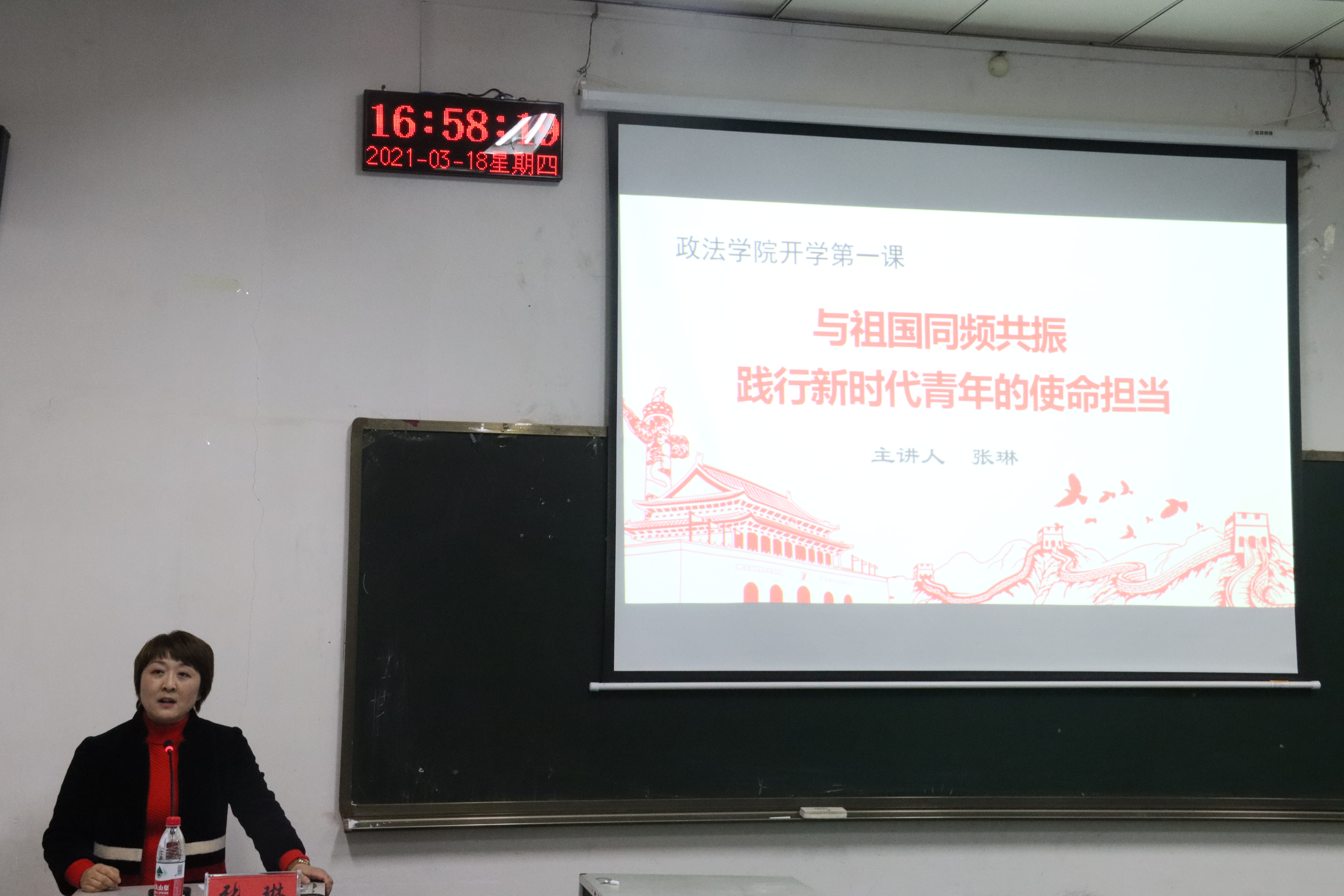 党委书记张琳以《与祖国同频共振,践行新时代青年的使命担当》为题,围绕“收心”、“立志”、“开启行动”三大主题进行讲授。她指出,广大学生要在信息大发展的时代做到“两耳多闻窗外事,读书学做明白人”。并就如何践行新时代青年的使命担当提出了几点要求,一是作为当代大学生要做到坚定自信,把自己的理想同祖国的前途、把自己的人生同民族的命运紧密联系在一起,做一个热爱祖国,忠于人民的有志青年;二是要时刻剖析自己,明确自我定位,做好人生规划,努力成为新时代的优秀青年;三是要学会立足当下,无论是选择研考、公考或法考都要认真对待,勤奋学习,努力做新时代具有过硬本领的接班人。此外,针对我院新推出的“四年一贯制”导师培养战略,希望同学们要选择适合自己的导师,积极抓住各种机会锻练、提升自己的专业素养。