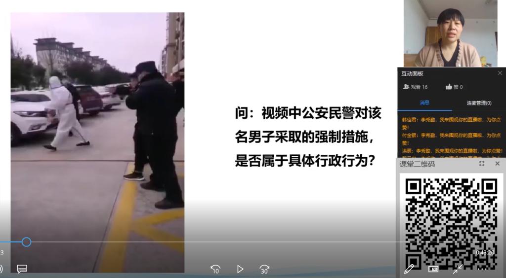 2020年春季学期的教学安排被疫情打乱,在教育部提出“停课不停学”的号召之后,学校积极相应,并部署了线上教学计划。由李秀勤老师主讲的《行政法与行政诉讼法学》课程于2月17日通过线上方式开始教学活动。为达到线上线下教学“实质等效”的目的,李老师从教学理念、教学方法、教学实施和教学评价等方面进行了改革,取得了良好的效果。