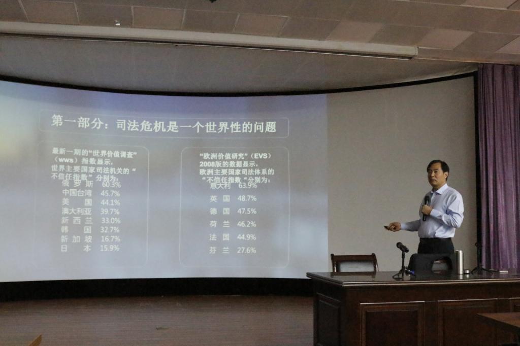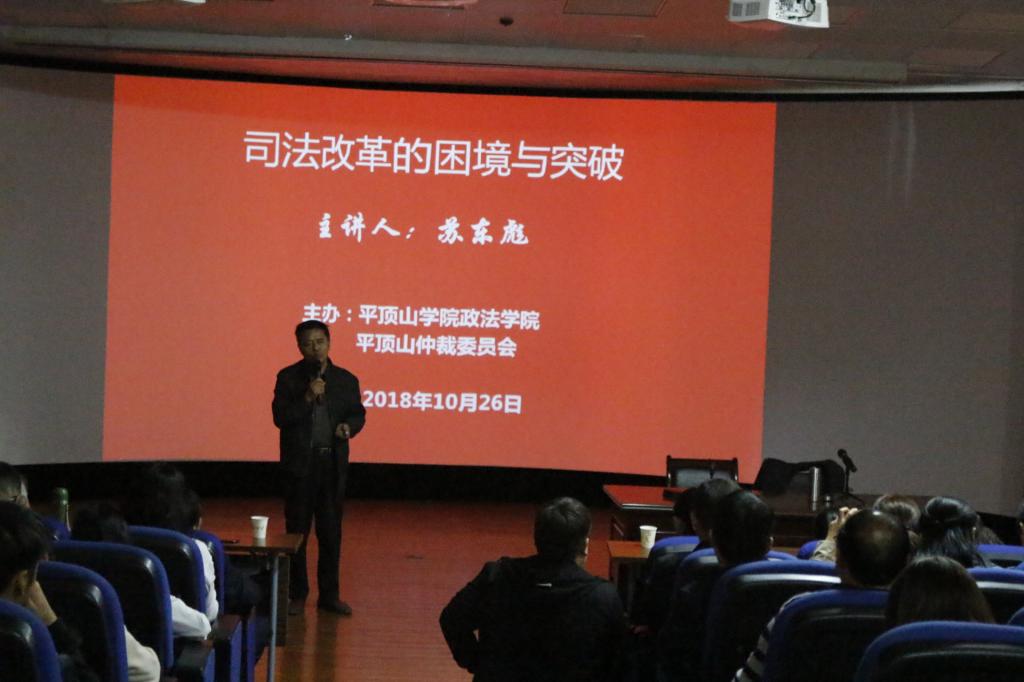 10月26号下午,平顶山仲裁委员会与我院联合举办的“司法改革的困境与突破”主题的讲座在2106教室开展。讲座由平顶山仲裁委委员、平顶山市律协副会长苏东彪主讲,william威廉院长徐双喜出席讲座并致开幕词,william威廉全体同学一同聆听了此次讲座。
