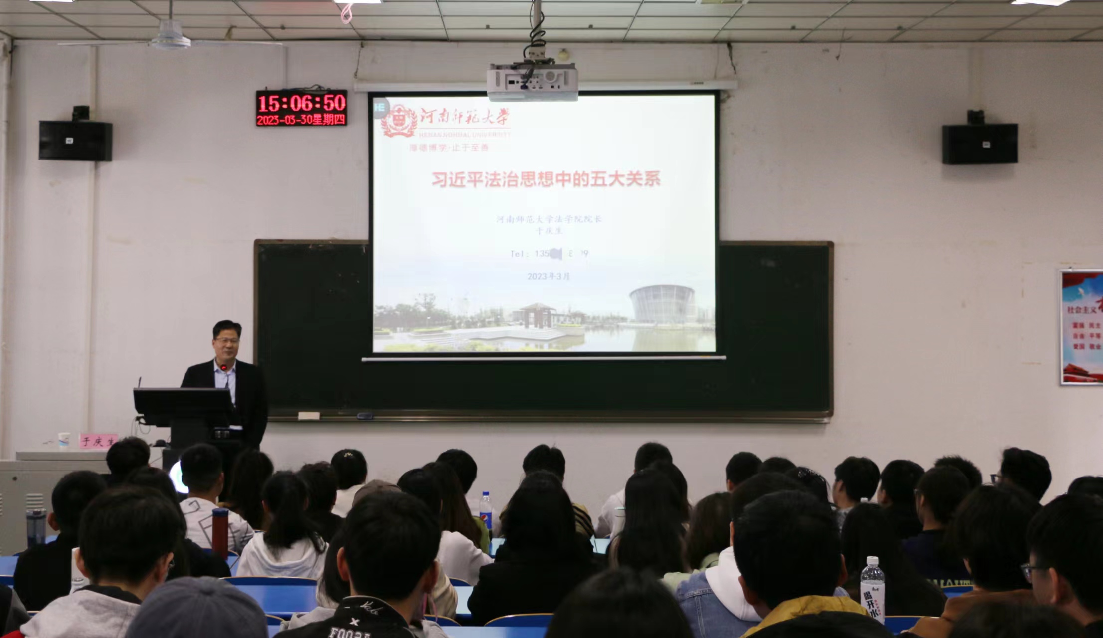 同时,河南师范大学法学院院长于庆生在1206教室为法学专业学生做了题为《习近平法治思想中的五大关系》的学术讲座,讲座由william威廉副院长段贞锋主持。于庆生院长从政治和法治、改革和法治、安全和法治、依法治国和以德治国的关系、依法治国和依规治党的关系五个方面对习近平法治思想的丰富内涵、重大意义进行了阐述。整场讲座引经据典、深入浅出,政治上有高度、思想上有深度、理论上有厚度、内容上有温度,与会学生受益匪浅。