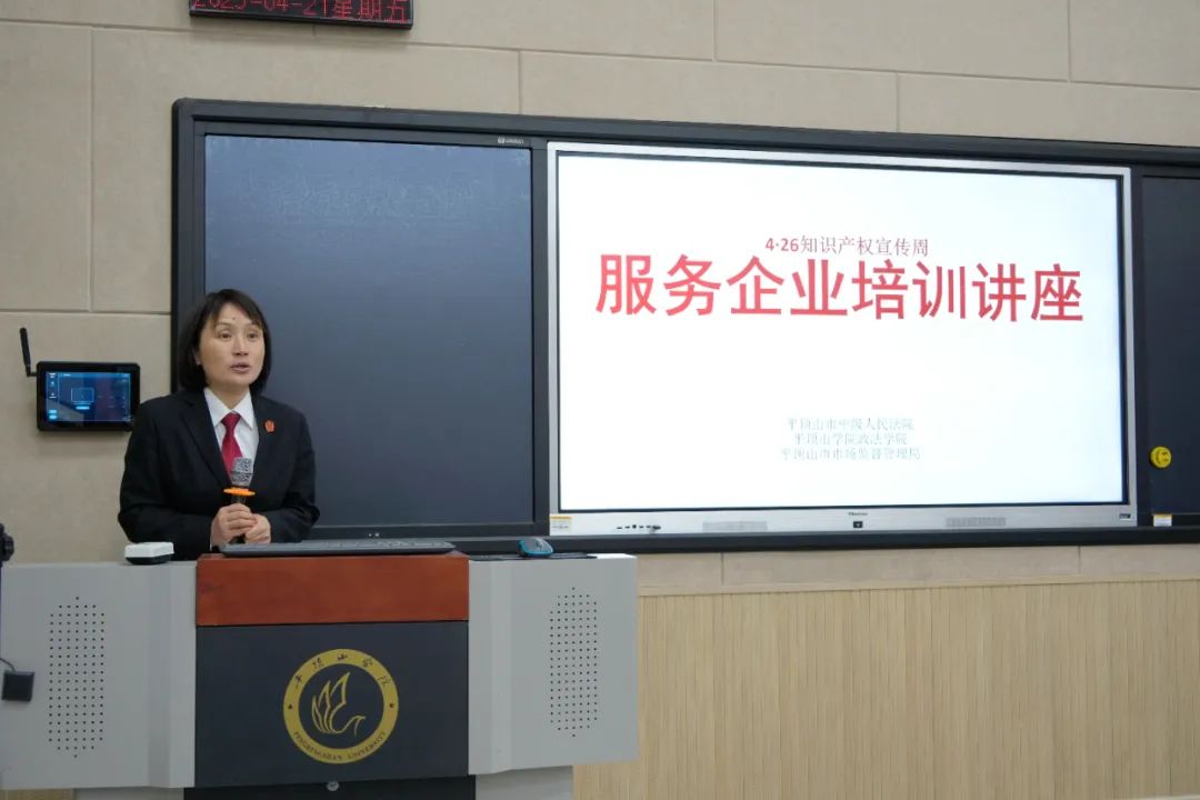 在4月26日世界知识产权宣传日来临之际,4月21日下午,平顶山中院联合平顶山市市场监督管理局(知识产权局)及我院共同举办了“企业知识产权保护专题培训讲座”活动。活动在我校图书馆206教室举行,我院知识产权负责人彭丹丹博士作了服务企业培训专题讲座,全市在知识产权领域具有代表性的高新技术企业、科技型中小企业等20余家企业、市市场监督管理局(知识产权局)知识产权保护科科长郑建东参加活动。讲座由训由市中院民三庭副庭长盛华平主持。