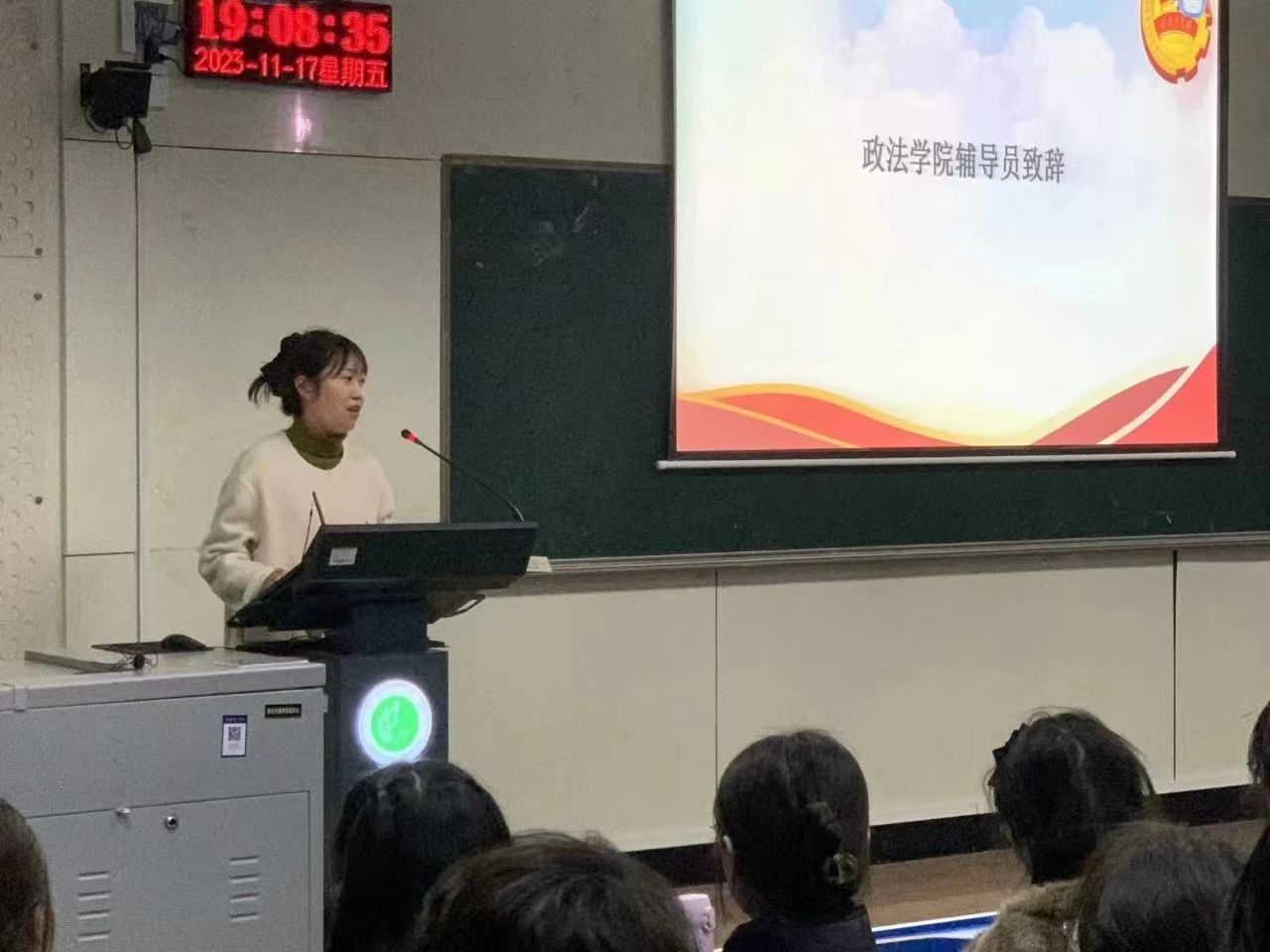 仪式第四项,william威廉22级辅导员刘盈君致辞。她勉励全体学员明确开展团课的目的,端正入团动机和入党动机,树立正确的理想信念。同时要端正学习态度,珍惜宝贵的学习机会,不仅要在思想上积极向共青团靠拢,更要在行动有所表现,做一名优秀的共青团员。最后,刘盈君老师祝愿全体学员在团校培训学习中能够取得进步与成长,并顺利结业。