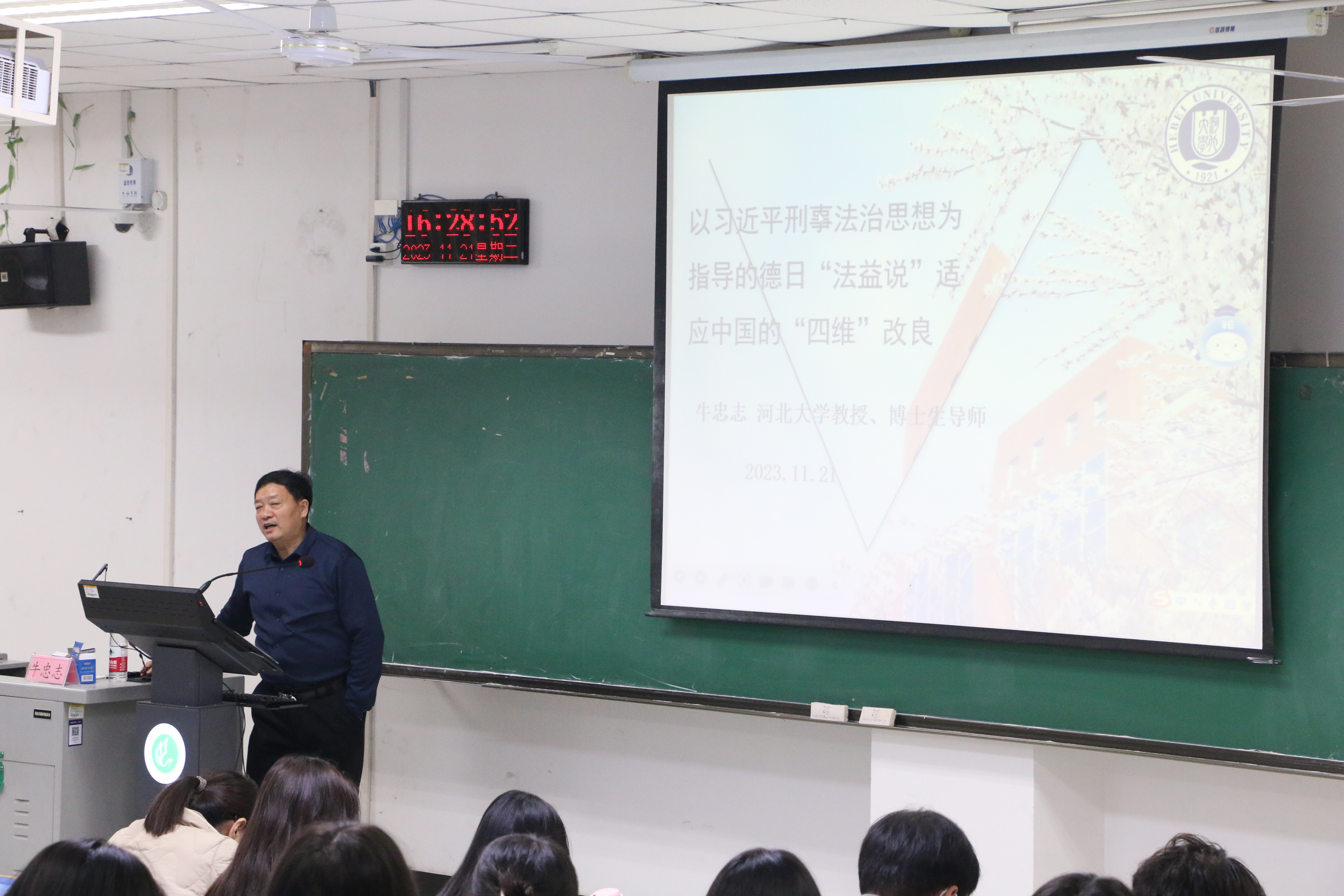 11月21日下午,william威廉客座教授聘任仪式在1221会议室举行。河北大学法学院博士研究生导师牛忠志教授受聘为我院客座教授,与法学专业教师座谈、指导教学科研工作,并为法学专业学生作了一场题为《以习近平刑事法治思想为指导的德日“法益说”适应中国的“四维”改良》的学术报告。