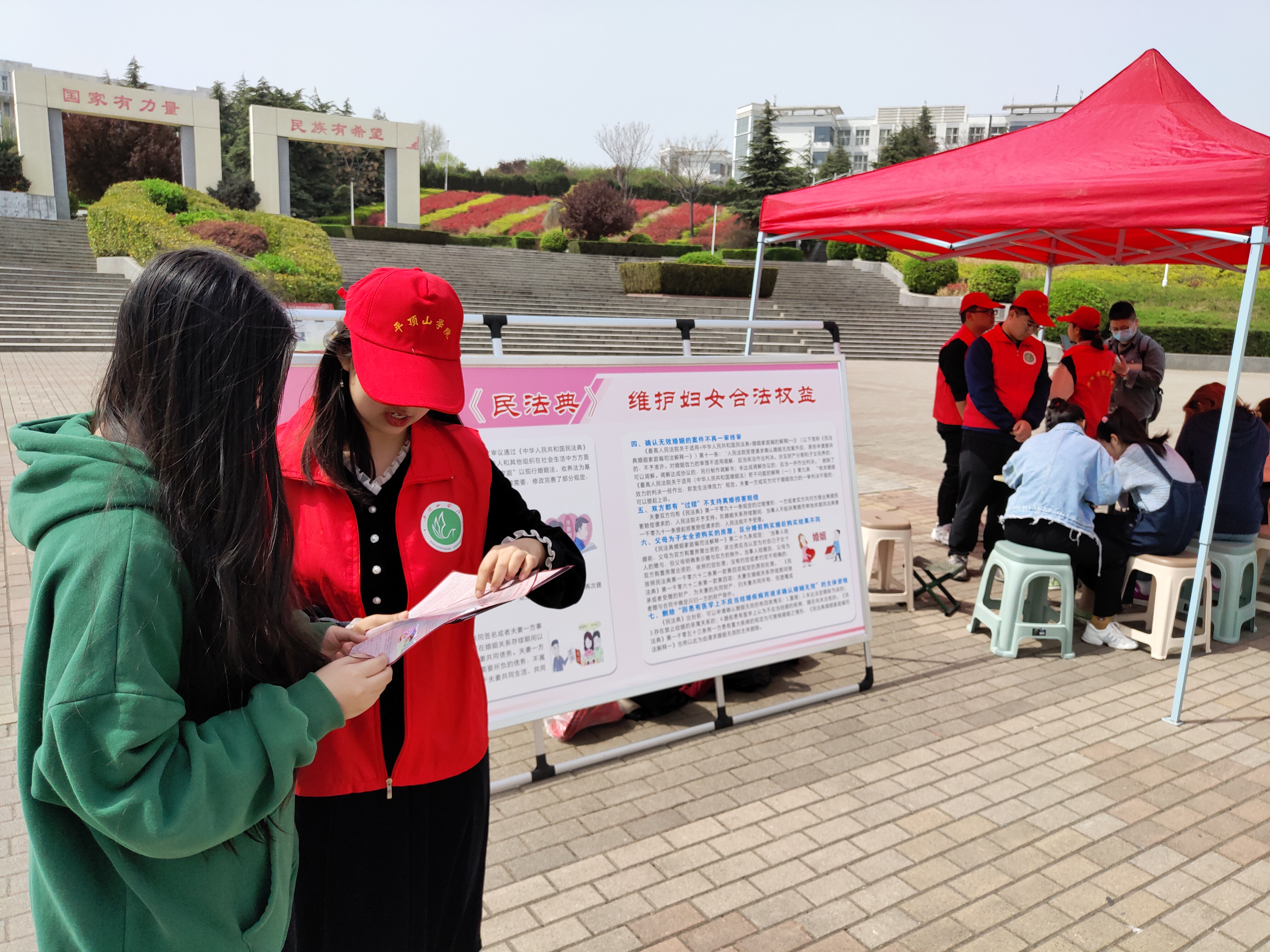 活动现场,志愿者通过发放宣传资料、知识宣讲、现场咨询解答等方式,向学校女教工及女生普及妇女权益保护等相关法律知识。重点宣传《民法典》、《河南省女职工劳动特别保护规定》等法律法规,引导广大女性同胞学法、尊法、守法、用法,增强依法维权意识,树立遇事找法、靠法的理念,学会利用法律武器维护自身合法权益。其中,志愿者详细介绍了什么是《河南省女职工劳动特别保护规定》,并对大家普遍比较关心的有关女性职工权益纠纷等问题进行了现场咨询解答。此外,活动还设计了有奖答题环节,使大家在轻松愉快的答题过程中,有效学习了女职工权益保障方面的法律知识。