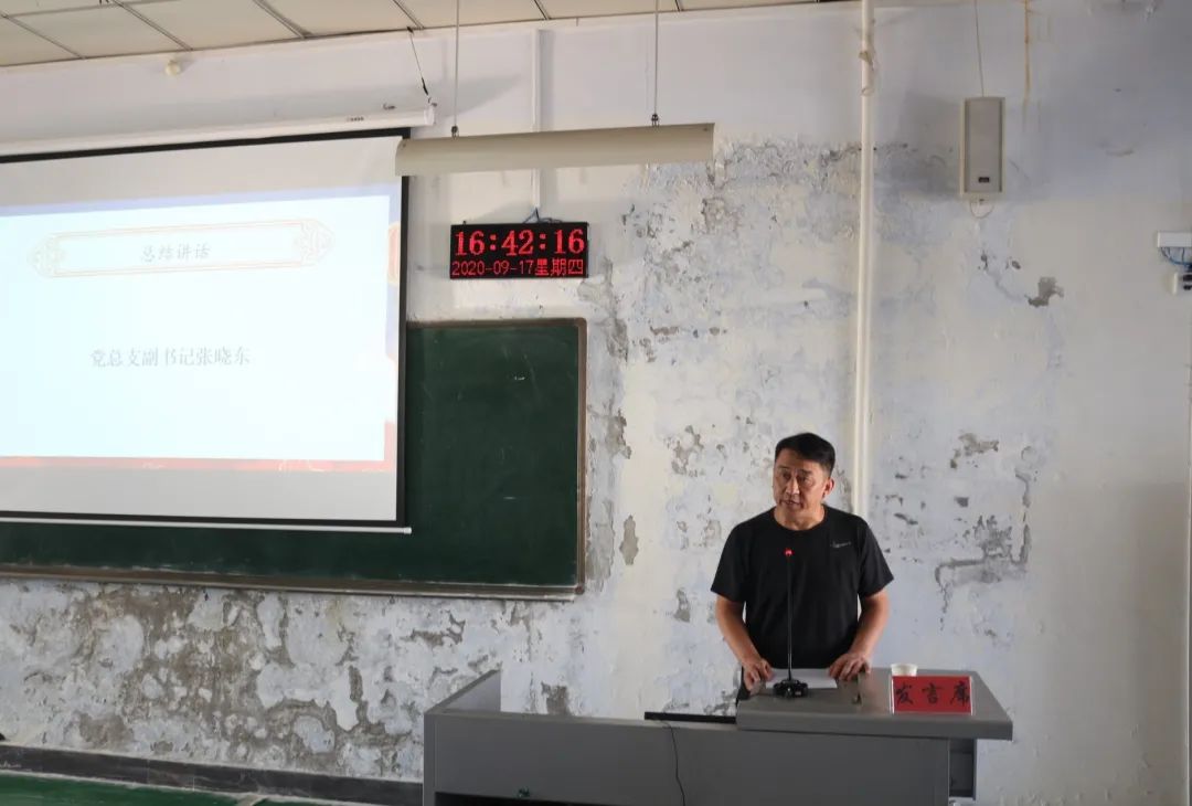 最后,党总支副书记张晓东书记为本次大会做总结讲话,他对在抗击疫情工作中做出突出贡献的先进个人和集体给予了高度赞扬,并倡导同学们向他们学习,同时张晓东老师也提出,目前疫情尚未结束,在校仍要遵守学校规定,减少走动,不出校门不聚集,保护好自身的生命财产安全。