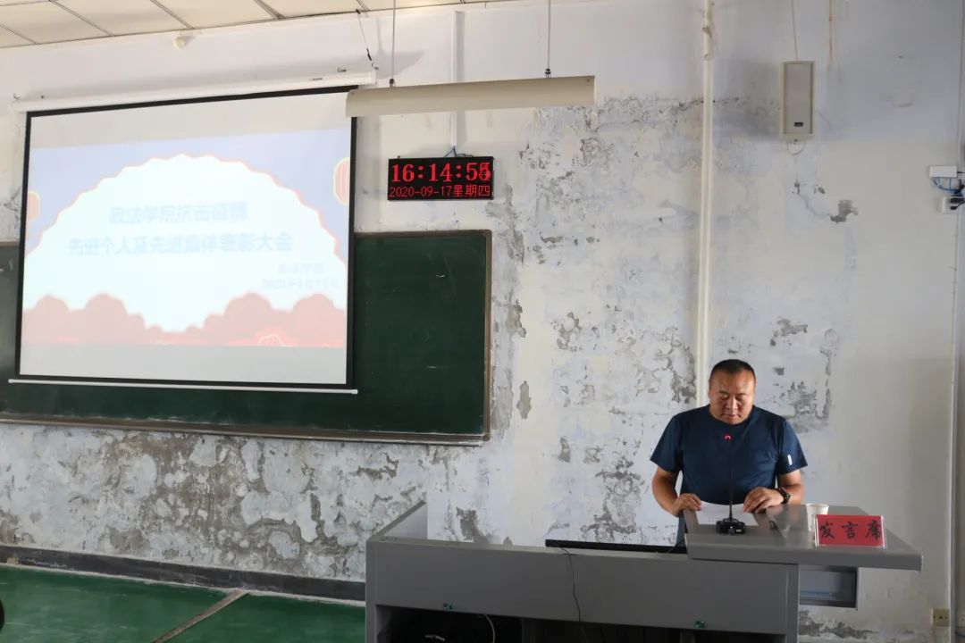 主持人致开幕词后,大会正式拉开序幕。首先,赵明跃老师宣读了本次大会的表彰决定,在热烈的掌声中,学院领导老师分别为获得抗击疫情先进工作者、抗击疫情先进集体代表以及抗击疫情先进个人颁奖。在过去大半年的时间里,他们中有的人在抗疫工作中积极配合院系,协助开展抗疫工作;有的人参加志愿活动,为家乡防疫工作尽一份力;有的人配合院系联系学生,在学生和学校之间搭建起桥梁,他们以严谨的态度对待每一份工作,认真地完成每一项任务,尽心尽力为学院服务,为青年学子树立起了良好的榜样。