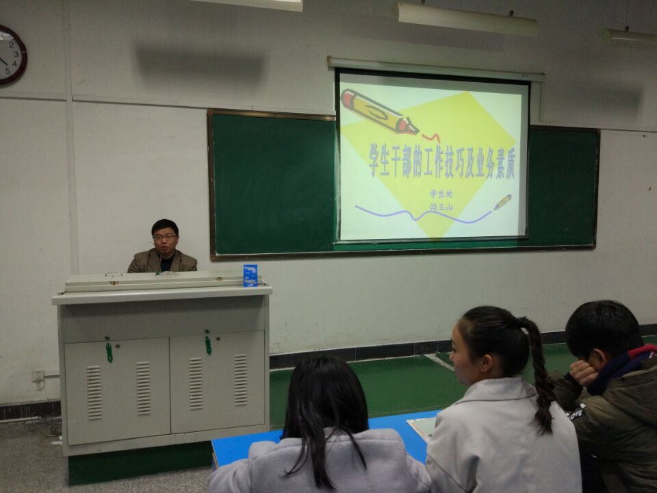 闫老师首先要求学生干部对所担任学生干部的角色进行定位,清晰、明确认识自己的身份,做好老师与同学之间信息的沟通与传递,搭建好人际关系,为同学服务。其次,通过交际能力,分析、判断、决策能力,组织能力,创新能力及公文写作能力等五方面向学生干部讲述了做好学生干部应有的业务素质。最后,闫老师重点讲述了有关学生干部在公文写作方面的技巧,引导广大青年学生干部在公文写作方面继续前进,并且他希望广大青年学生干部能够做学习与工作并重,成绩与业绩齐飞的践行者。
