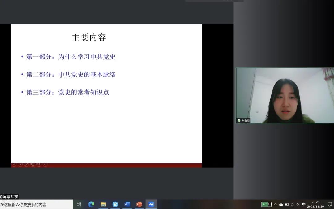 课堂伊始,刘盈君老师带领大家观看了党史视频,为团员们详细讲述了学党史的背景。随后,刘老师通过为什么学习中共党史、中共党史的基本脉络、党史的常考知识点三个部分展开讲解。首先,刘老师从习近平总书记重要谈话指示和学习党史对团员、对社会主义建设事业的意义等方面解释了我们为什么要学习中共党史。接着,刘老师从四个时期梳理了中国共产党一百年辉煌史的基本脉络,带领团员们总结了中国共产党成功的根本原因。