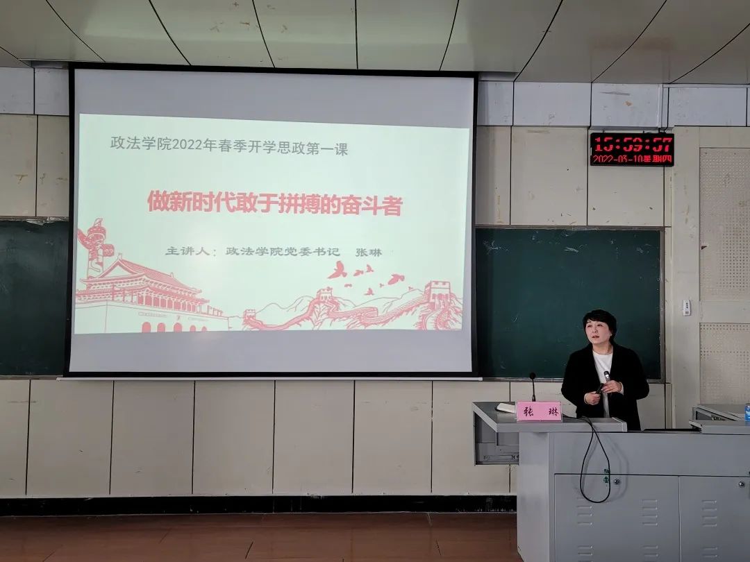 党委书记张琳以《做新时代敢于拼搏的奋斗者》为题,从北京冬奥会开幕式呈现的中国文化自信入手,谈中国青年人勇于拼搏、永不言败的志气、骨气、底气;结合中国女足亚洲杯逆转夺冠,谈青年学子要敢于面对困难与挫折,在顺境中不骄傲、在逆境中不服输。此外,张琳还带领同学深入学习中国共产党河南省第十一次代表大会精神,并详细解读“两个确保”奋斗目标、全面实施“十大战略”的重要意义和丰富内涵。最后张琳鼓励学生们,新学期要有新气象,要继续在确立目标中找准人生方向,在笃行不怠中选择坚忍不拔,在踔厉奋发中始终心向未来,珍惜美好时光,绽放青春光芒,以奋进者的昂扬姿态迎接党的二十大的召开。