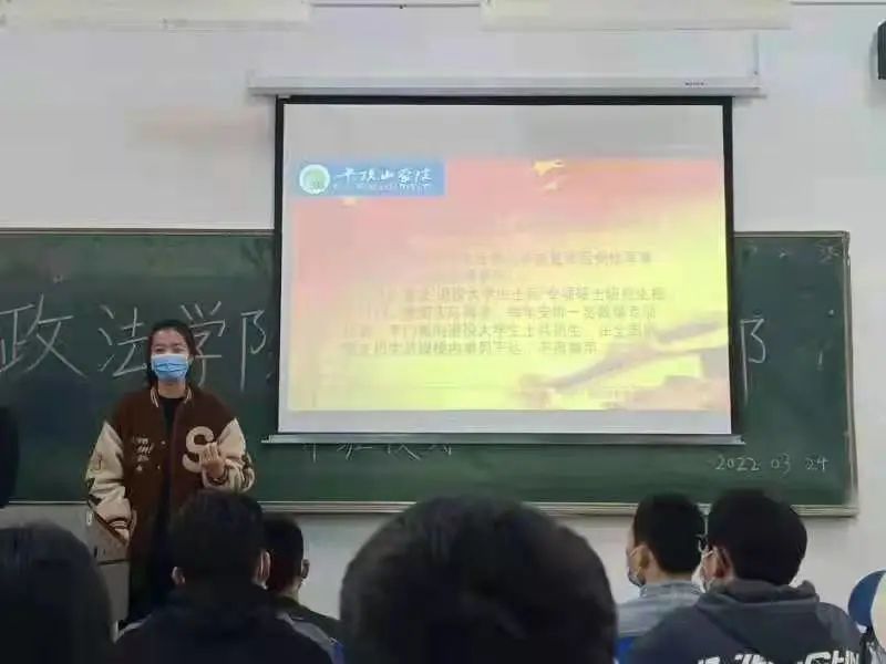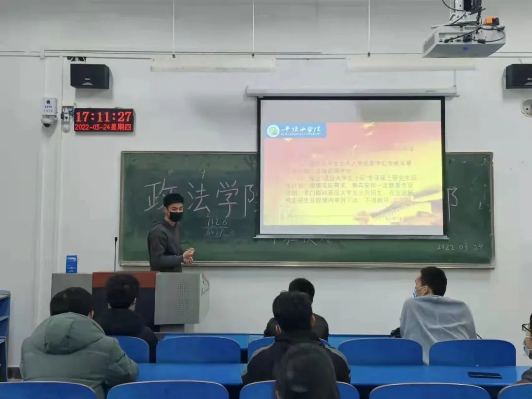 最后,辅导员赵明跃进行了总结发言,在总结发言中,赵明跃对三位退伍士兵同学给予高度评价,为同学们细致分析作为大学生的我们为什么要参军、参军有什么意义以及大学生参军入伍的优惠政策等。鼓励同学们,要坚定信心,做到早准备、早锻炼、早报名朝着军营梦努力,争取早日身披戎装入军营,练就本领报家国,为自己未来的就业和人生发展开辟一条新路径。