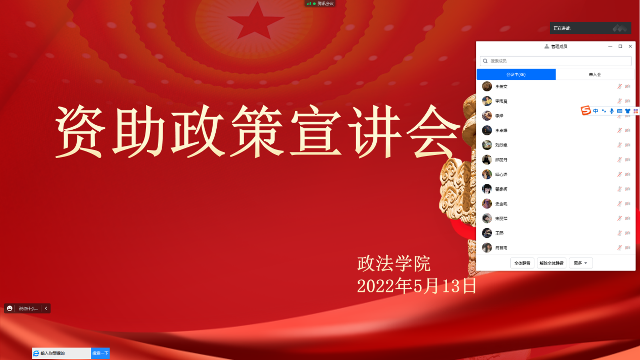 为了贯彻落实国家资助政策,激励学生勤奋学习,让每一个学生都能顺利完成学业,5月13 日,我院开展了大学生资助政策线上宣讲活动。本次活动由生活权益中心负责人赵雨桐主持,通过腾讯会议的方式进行了全覆盖资助宣讲,宣讲内容包括国家奖学金、国家励志奖学金、困难等级认定等。