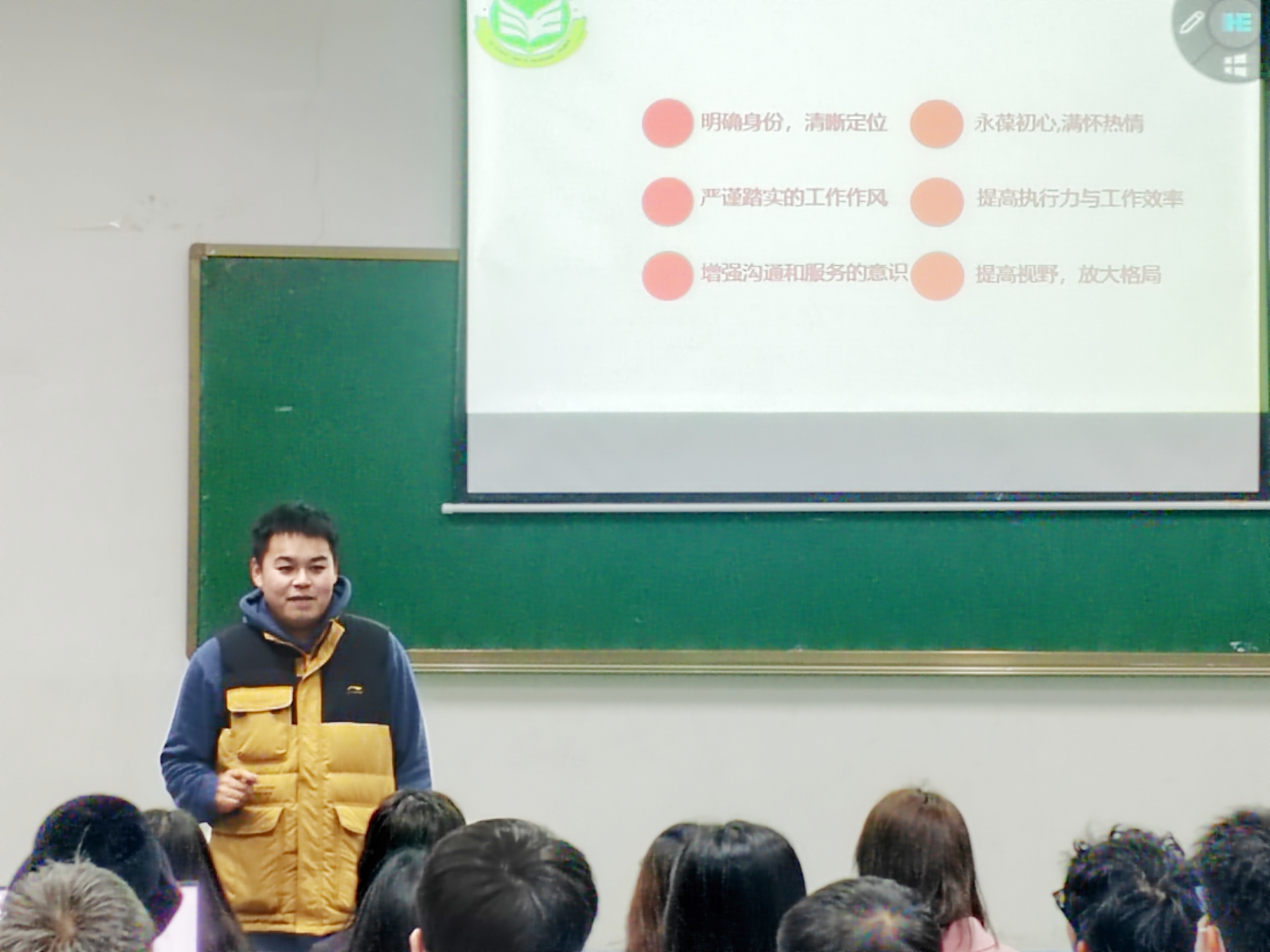邝增同样与大家分享了他在学生会工作中所积累的经验。他指出要养成定期思考总结的工作习惯,制定自己的目标计划,在工作中提升自己,让工作为理想助力。接着,他强调了语言沟通能力和表达能力的重要性,给大家提出了许多与老师、学长学姐和同学的沟通建议,告诉我们沟通时要保持礼貌、把握分寸、做好准备、多理解和包容。最后,他鼓励同学们一定要勇敢表达自己,勇敢做自己,做一个有能力,有理想的人。他幽默风趣的语言,获得大家的一致喝彩。