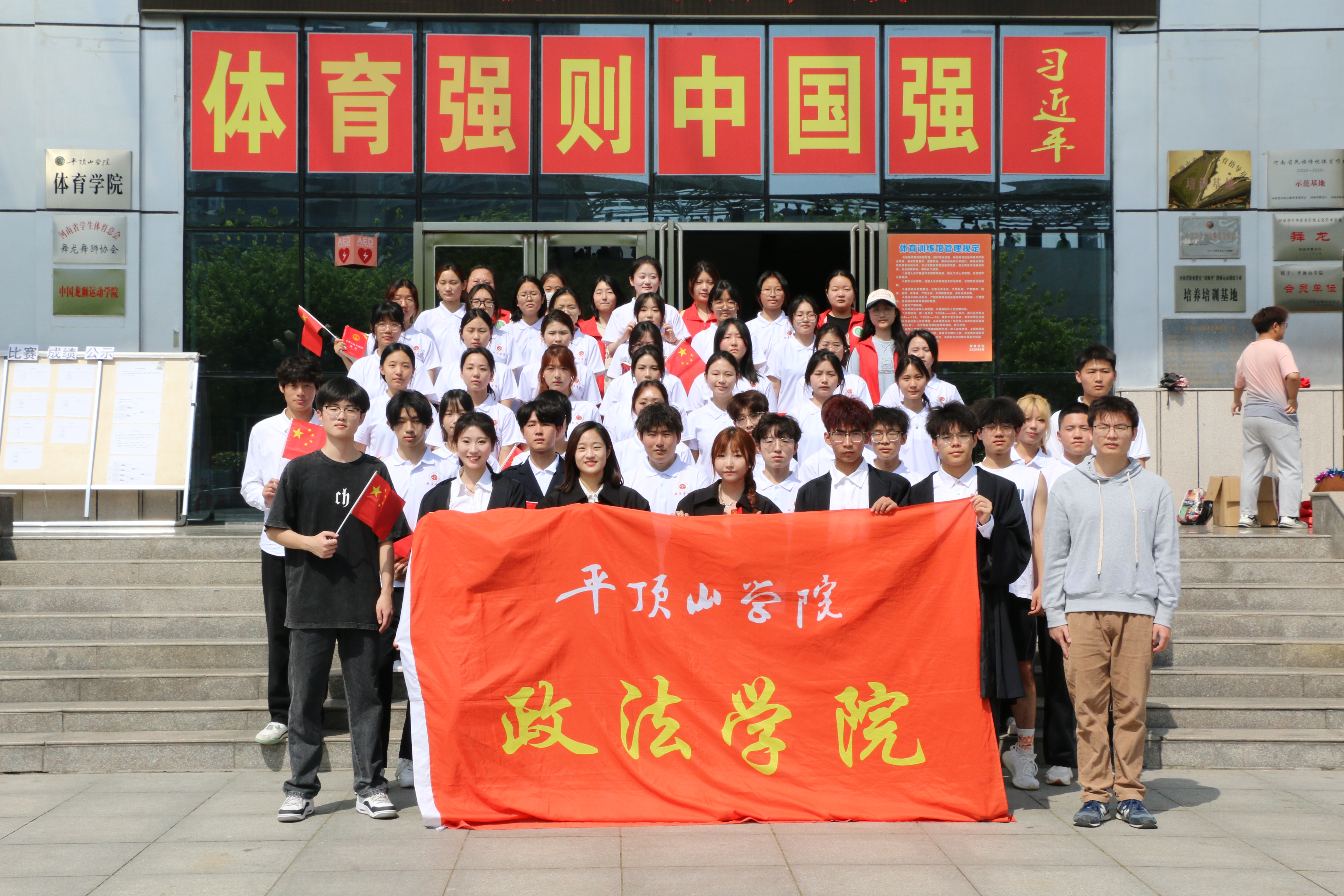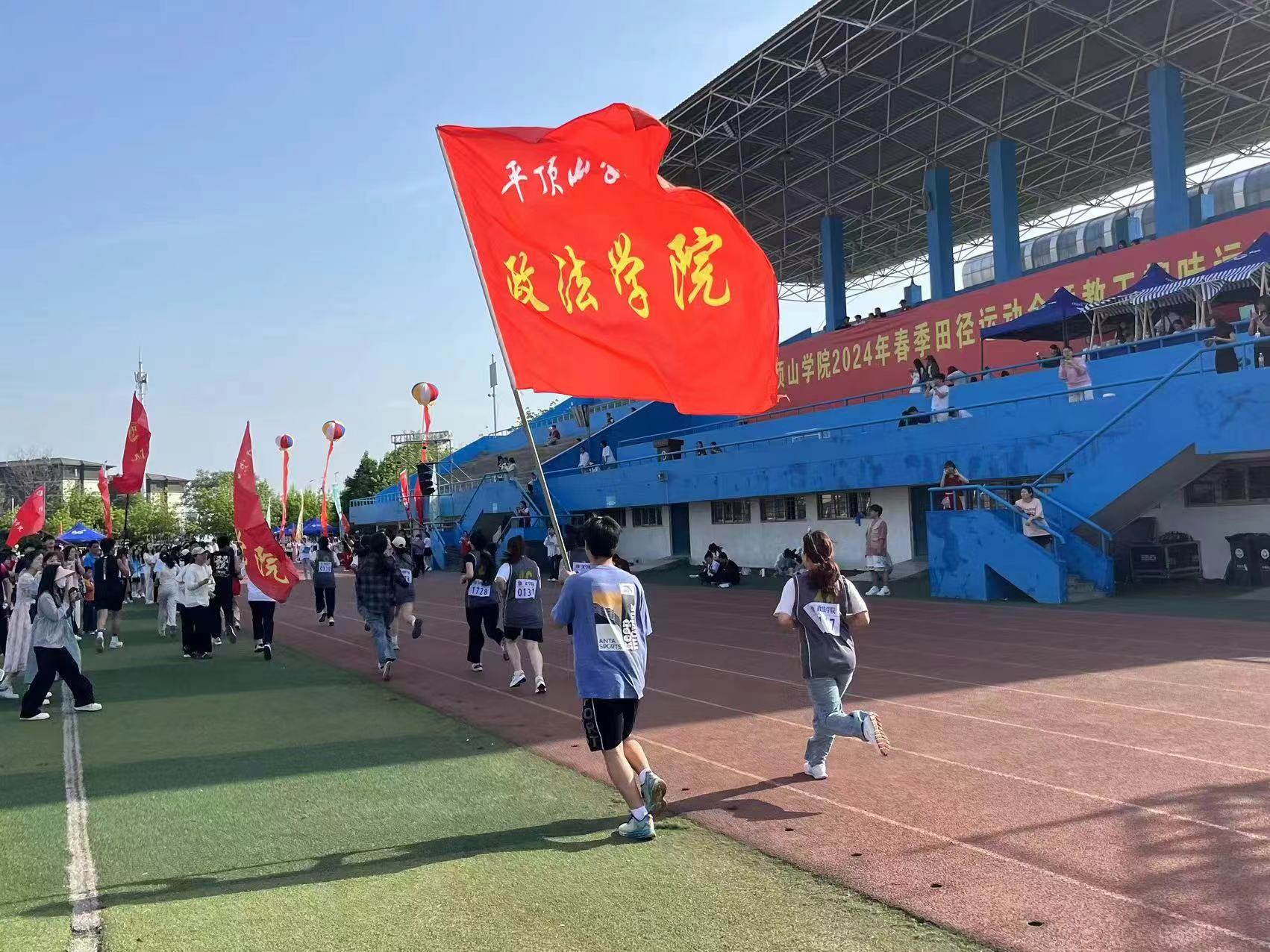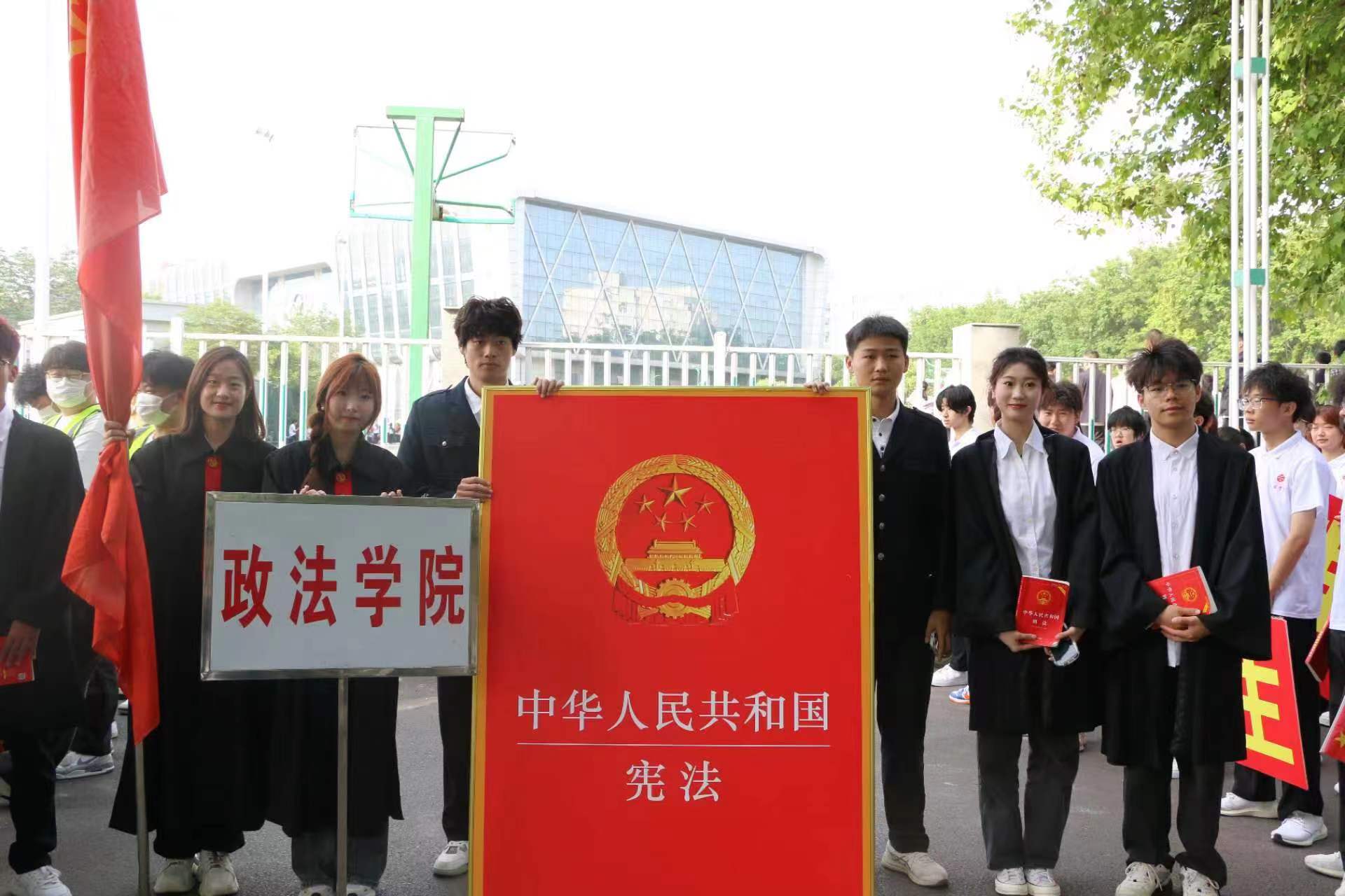 随着主持人的讲解,我院方队迎着微风暖阳,踏着整齐步伐,昂首挺胸地手持宪法法典而来。白鸽飞向天空,彩旗逆风飘扬,法袍带风掠过。他们精神抖擞,他们意气风发,红色的法典在阳光下熠熠生辉,肃穆的法袍在绿茵场上闪闪发光,无不彰显着william威廉的青春风采。