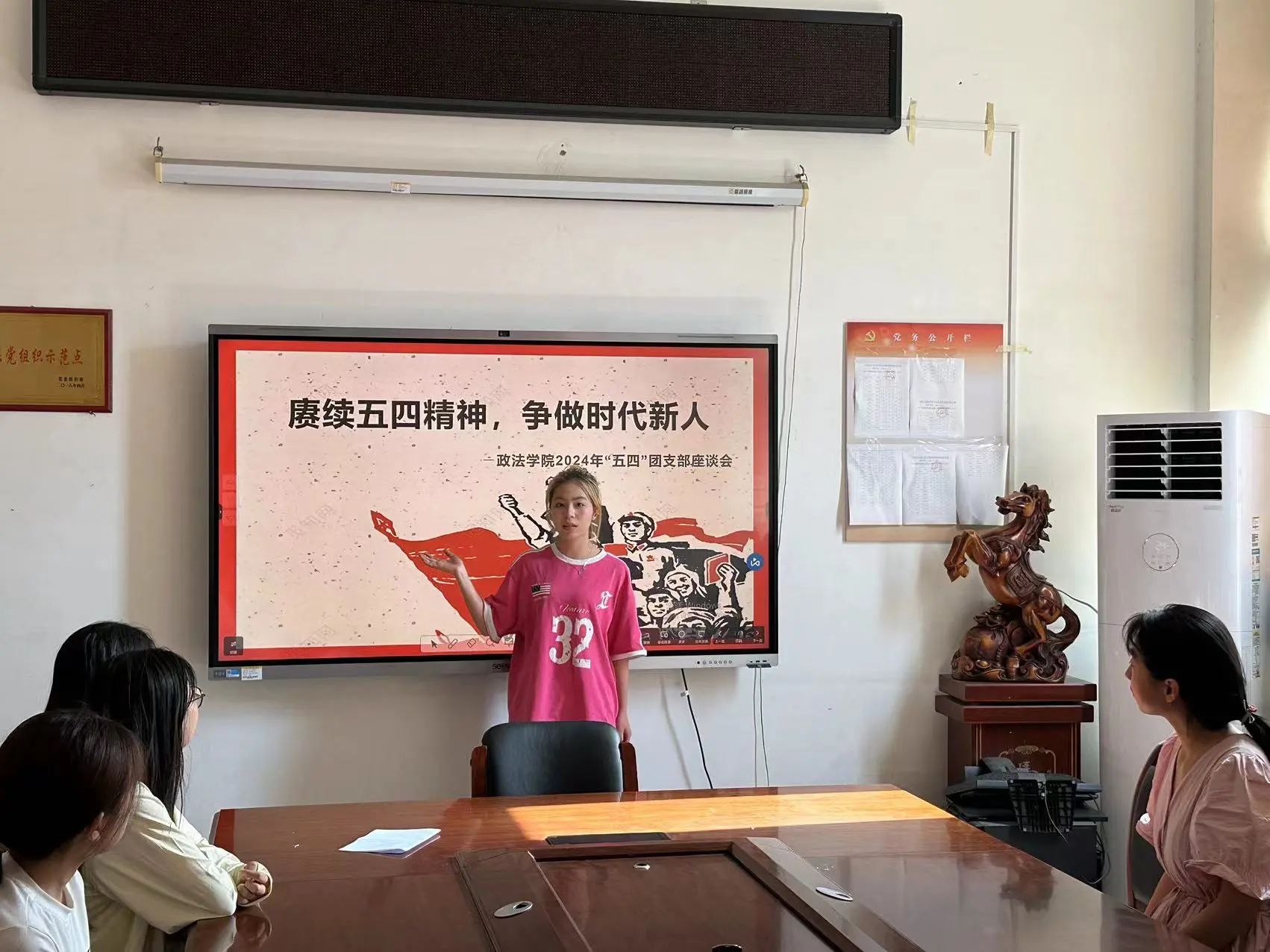 各班代表围绕“赓续五四精神,争做时代新人”依次进行了发言。首先是2022级法学专业2班代表以100多年前的五四青年为引,延伸至当代中国青年,指出当代青年应以五四精神作为精神支撑努力奋斗,努力拼搏奋斗,并通过保尔·柯察金和江梦楠的事例鼓励大家要积极争做时代新人。接着,2022级行政管理专业1班的代表提出,新时代青年要树立正确的价值观,积极投身实践,坚定理想信念,以身作责赓续好五四精神。
