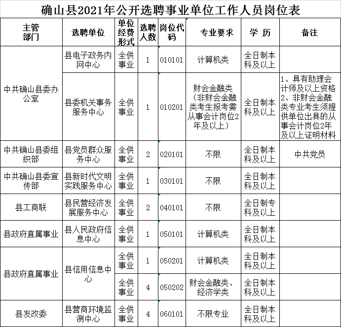 具体岗位情况详见《确山县2021年公开选聘事业单位工作人员岗位表》(见附件)。各岗位选聘人数与通过资格审查的人数之比不得低于1:2,否则,选聘名额按比例核减直至取消该岗位选聘计划。